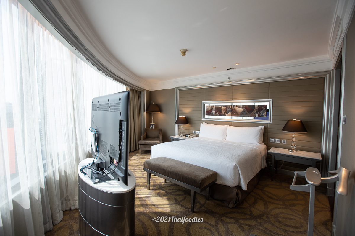 The bedroom has a stunning Bangkok city view, King size bed, dressing table and a couch with a wardrobe including a safety box, slippers, and bathrobes. The big bathroom has a separate shower room and bathtub with a range of luxurious toiletries.