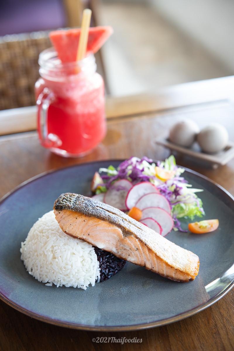 Enjoy fresh bakery and thai fruits, Pork boiled rice, Chicken fried rice, Prawn fried rice, noodles, Pancake, Waffles, a selection of bread, sausages, french toasted, hash browns, poached egg served with salmon avocado and fresh fruit juice.