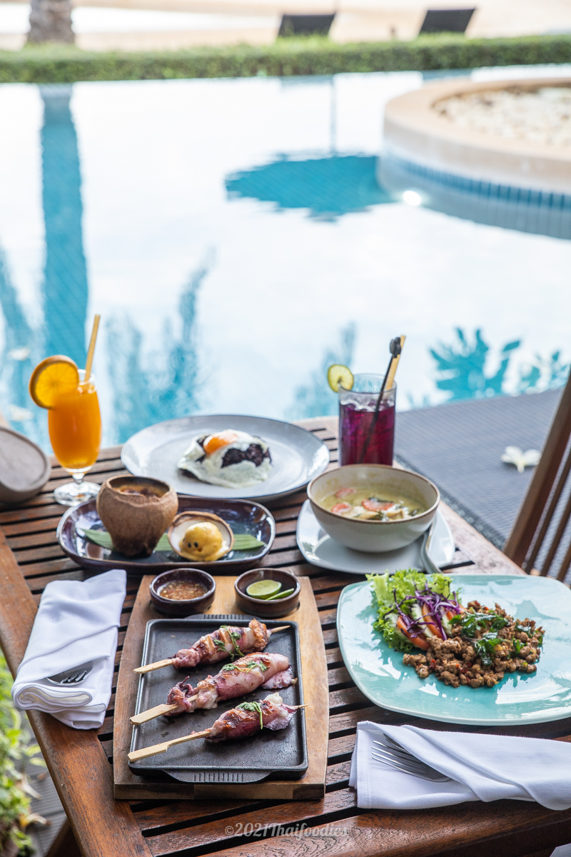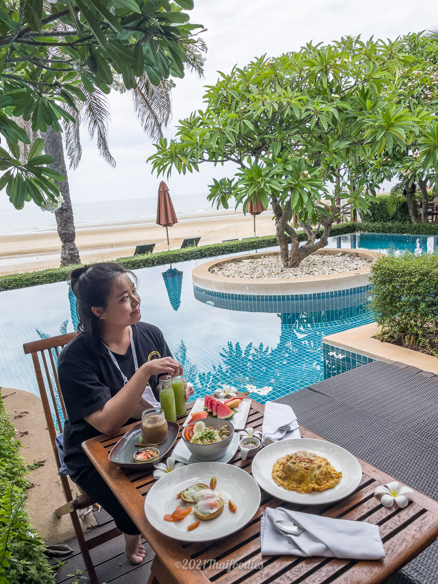 During this serious situation in Thailand, We always try to keep safe, and maintain social distance. So we took advantage of room service during our stay here. The food at Aleenta restaurant is unique, They have many categories of food. Vegan menu, Healthy menu, Paknam Pran (Pranburi local food) special menu, Western and Thai menu with delicacies dessert for selection and the the food is totally amazing! After we relax by the pool we ordered room service for our dinner, Everything was just delicious!