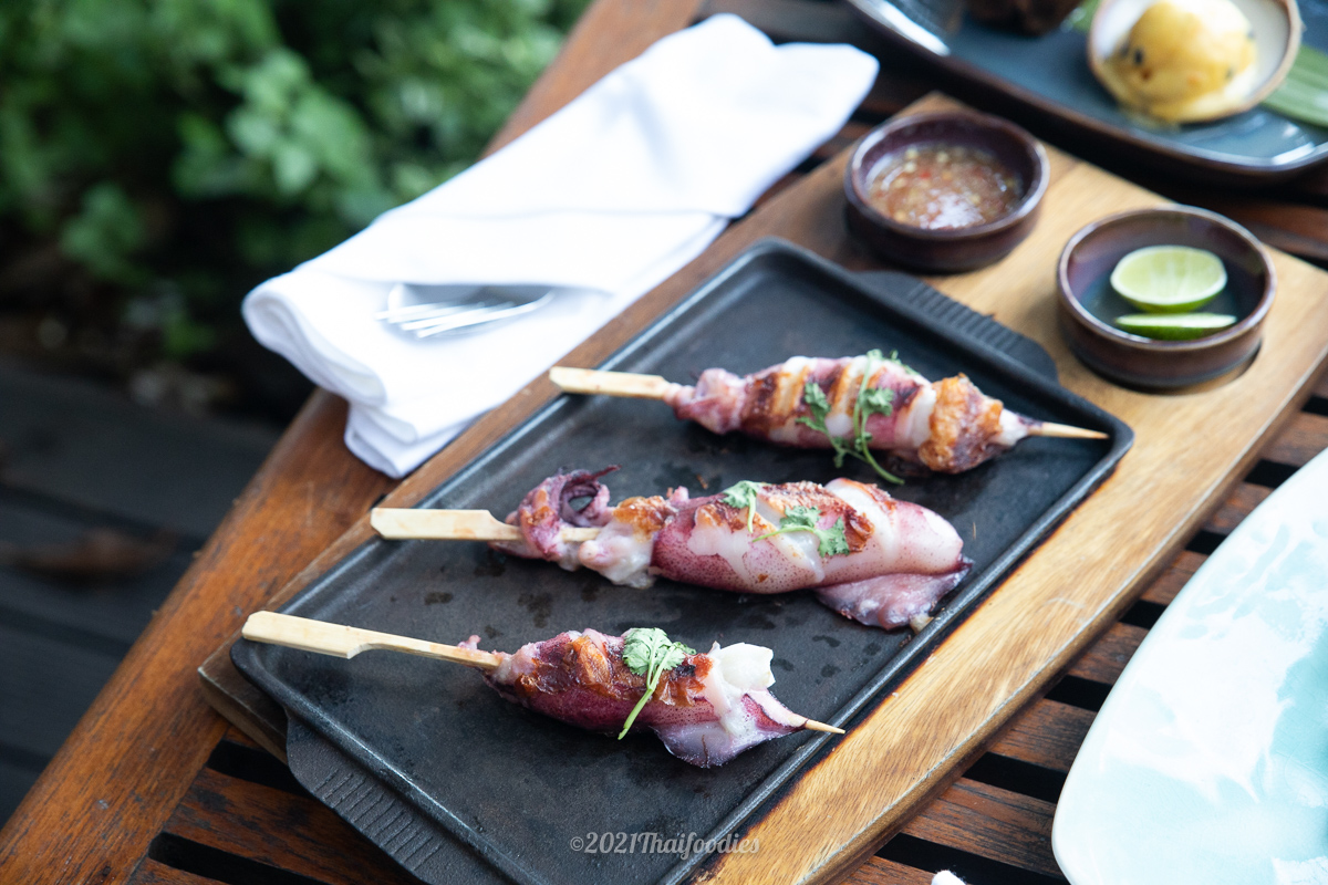 Calamari egg skewers with spicy seafood sauce (Meuk Khai Yang) ; the calamari is very fresh, juicy and a delicious combination with Thai seafood sauce. This dish is a must try!