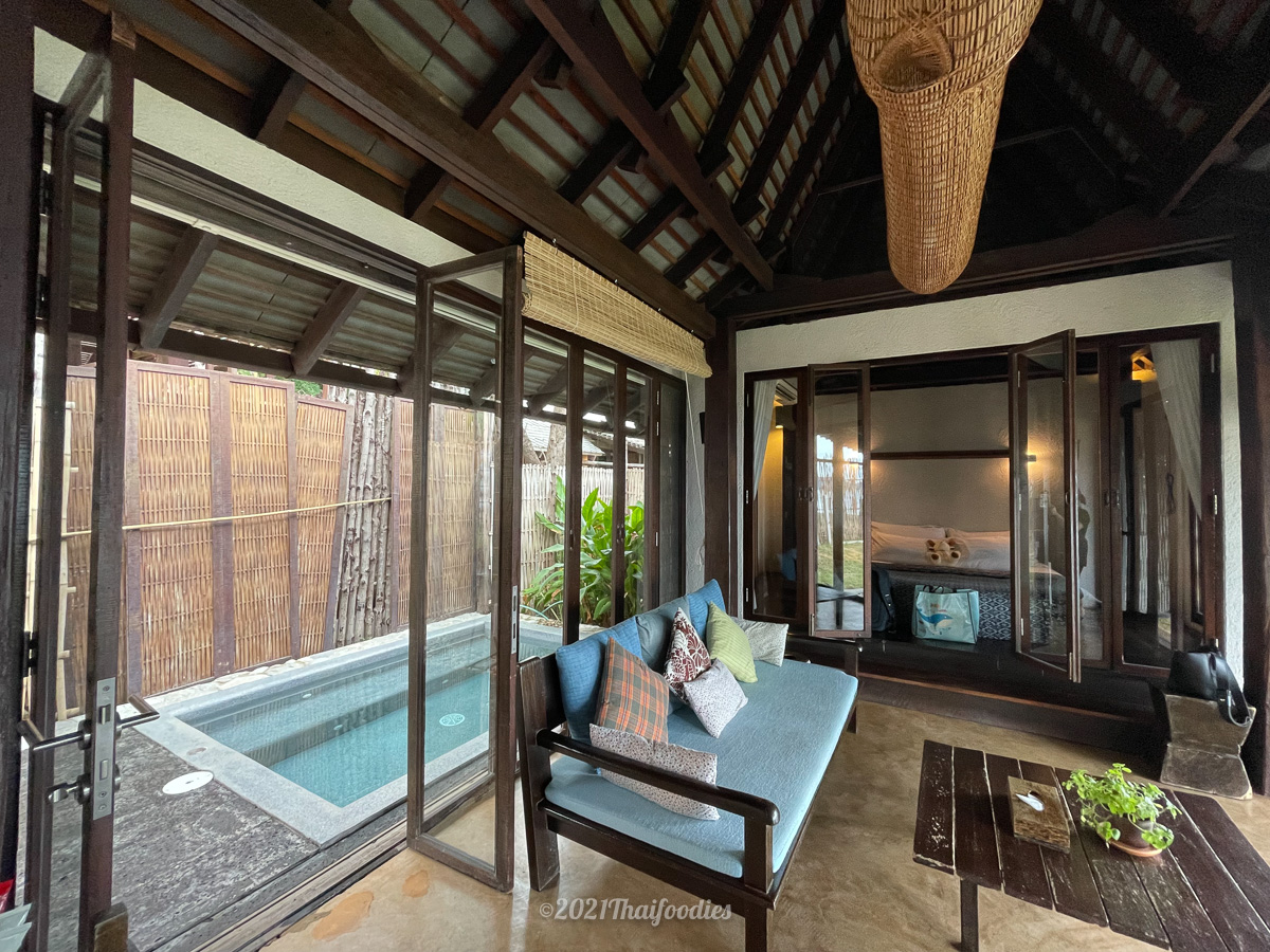 This cottage also has an outdoor private pool next to the living room with a nice beach view from your cottage, you can just walk to the beach from the resort!
