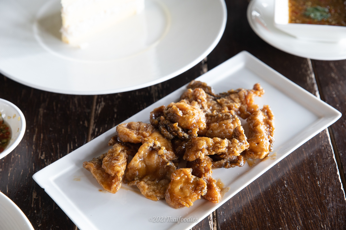 Deep fried sea bass steak with fish sauce.