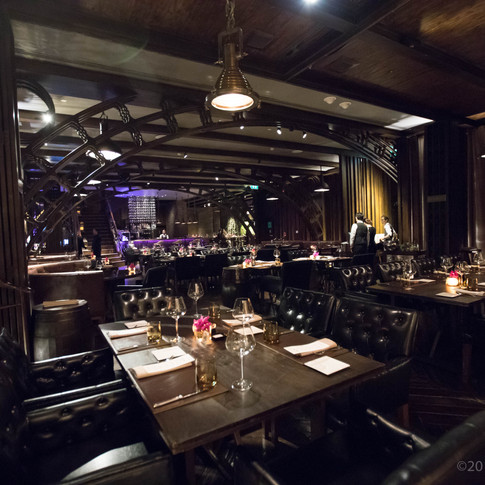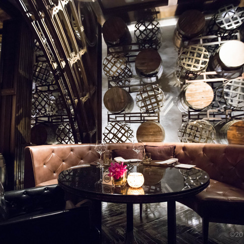 The Interior of Medici Kitchen and Bar is neo-industrial in design featuring subdued, gold lighting offset with deep. purple highlights. Faux wrought iron and wooden barrels line the walls of a dining room reminiscent of a 19th century wine cellar. Dark wood and cool, gleaming steel, and an open-kitchen round out the elegant decor.