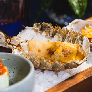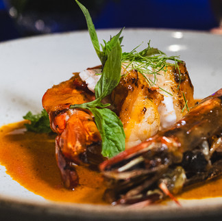 Char-Grilled Tiger Prawns: Infused with a deep, smoky aroma from coconut husks and served with a decadent Chu Chee curry sauce.